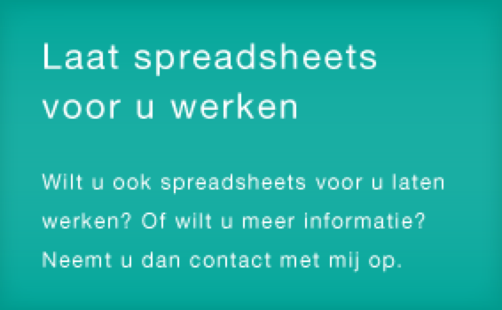 Wilt u ook graag spreadsheets voor u laten werken? Neemt u dan contact met mij op via onderstaand formulier of bel 06 - 36 49 45 86. Ik geef u een oplossing op maat.